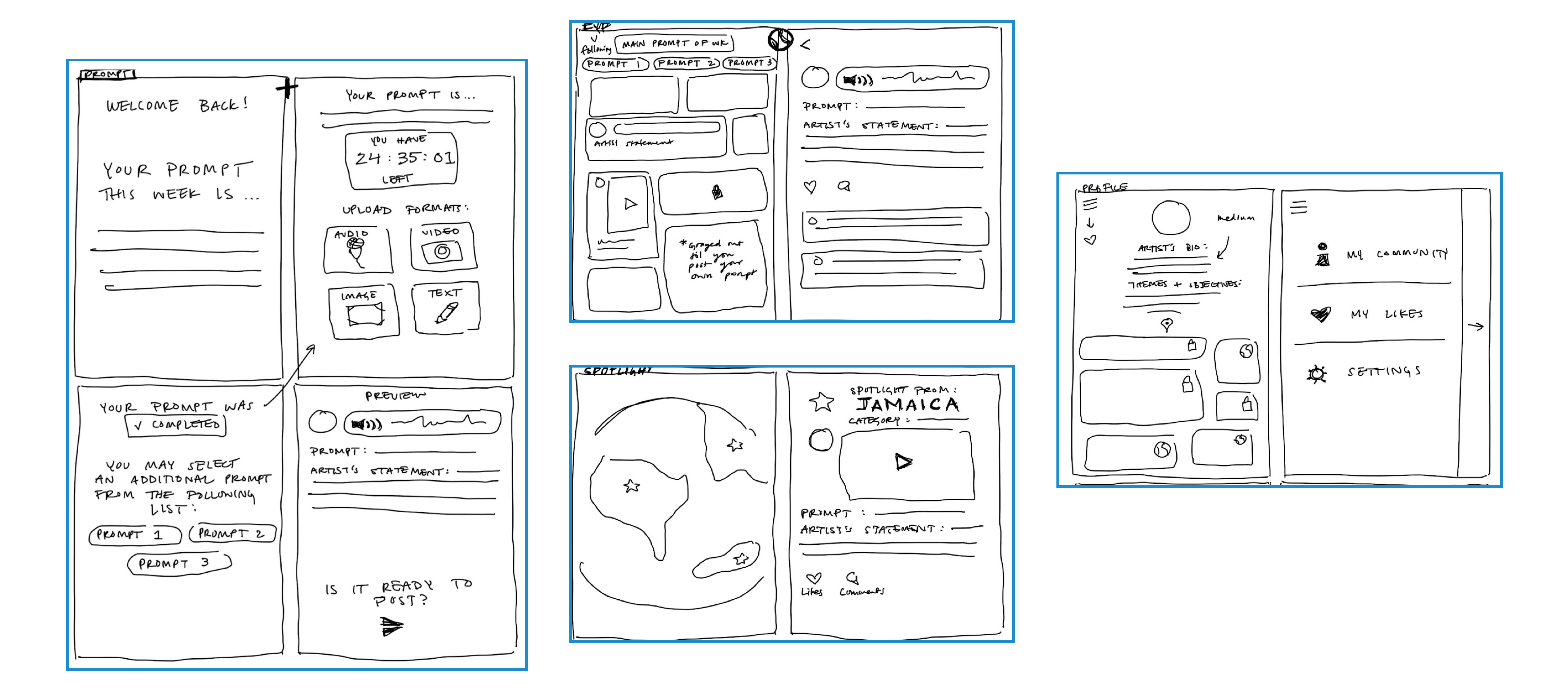 We started with simple wireframes to define the basic structure and layout of the app. These quick sketches allowed us to focus on core features, like the Prompt Page and Discover Page, ensuring the user flow was intuitive from the start.